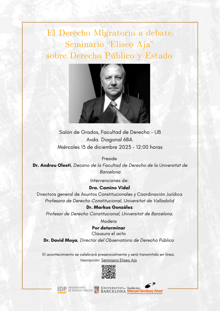 El próximo 13 de diciembre, es llevará a cabo la segunda edición del Seminario Eliseo Aja, enfocado en el ámbito del Derecho Público y el Estado. En esta ocasión, se abordará desde el ámbito del derecho migratorio, ampliando así el espacio de diálogo y reflexión anual que se ha convertido en un punto de encuentro esencial para discutir los desafíos clave que enfrenta el Estado social y democrático de derecho en España.